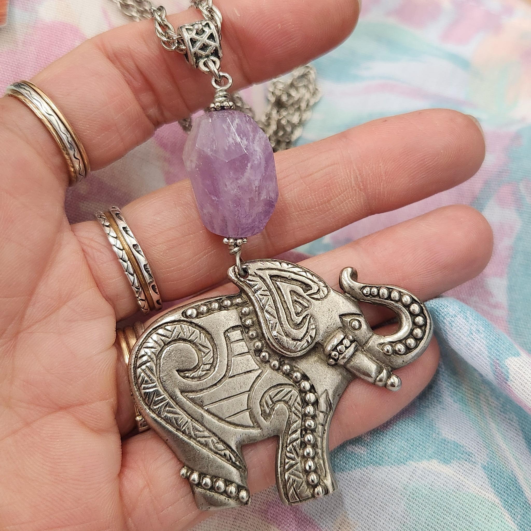 A vintage pewter lucky elephant brooch is recycled as a large pendant.  Lots of interesting etched details on this pendant.