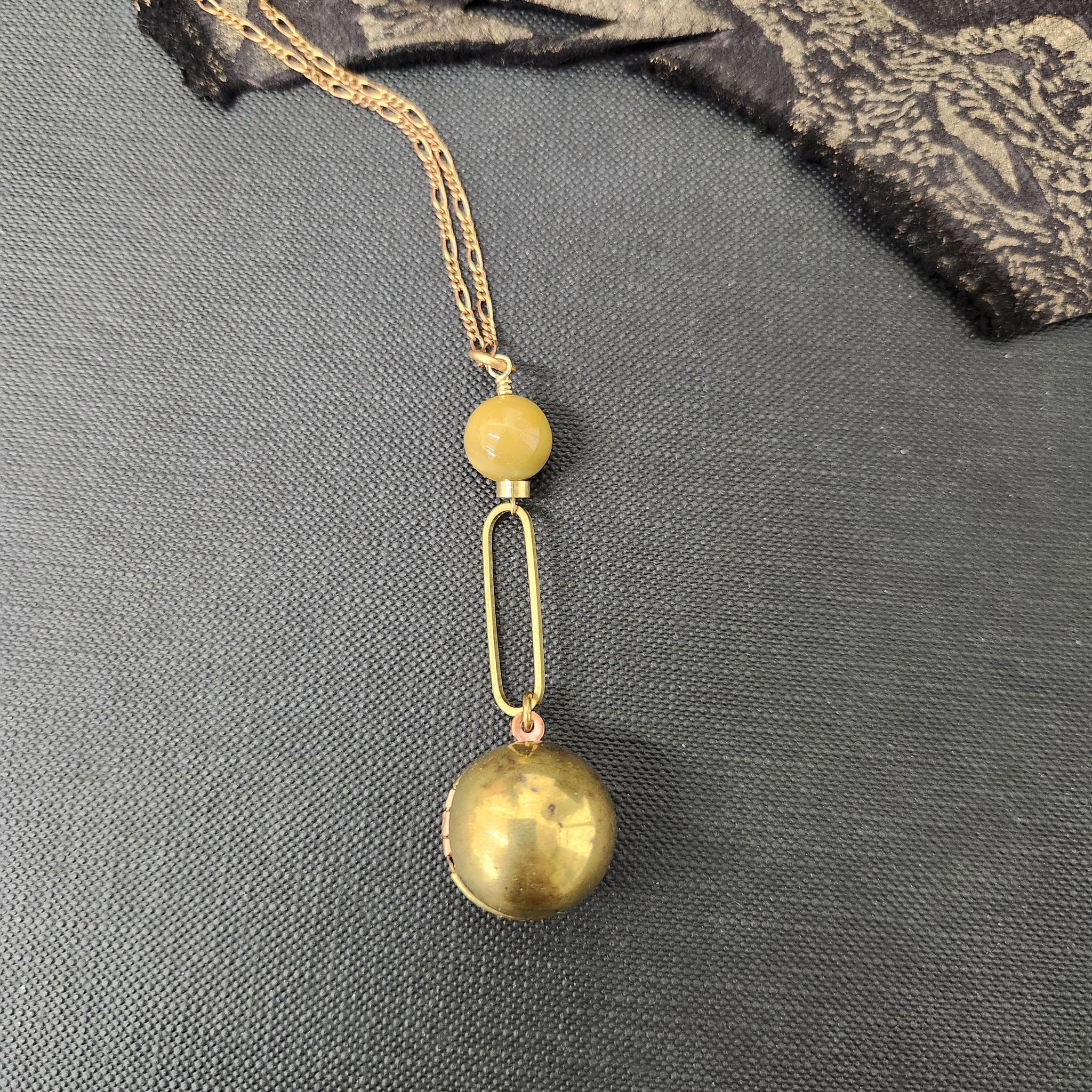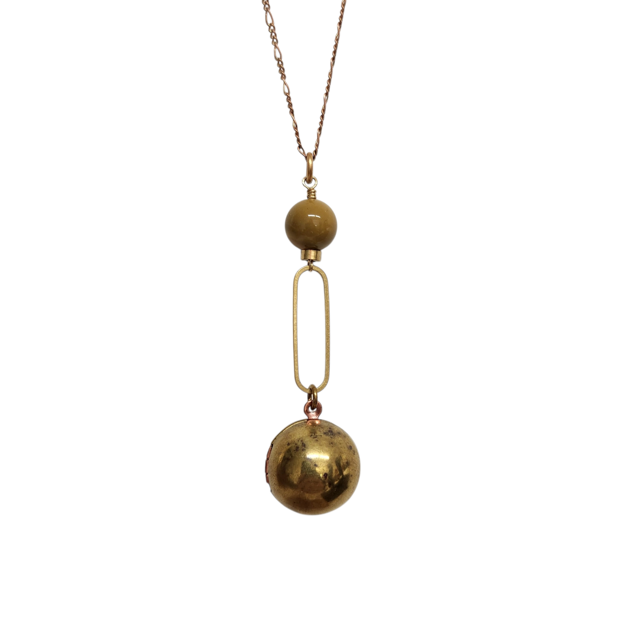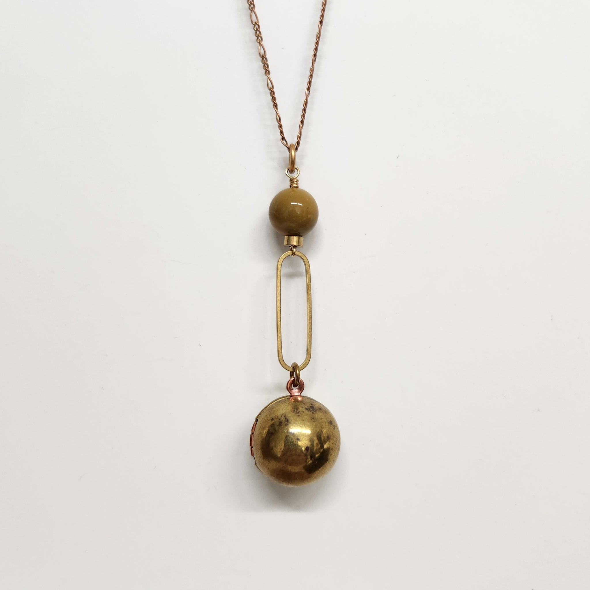 Added some geometry to the classic sphere locket. Smooth Australian mookaite stone, in a lovely mustard shade, sits atop an oblong brass ring with locket dangling below. Hung on a long vintage deadstock red brass figaro chain with spring ring clasp and signature wirewrapped closure.