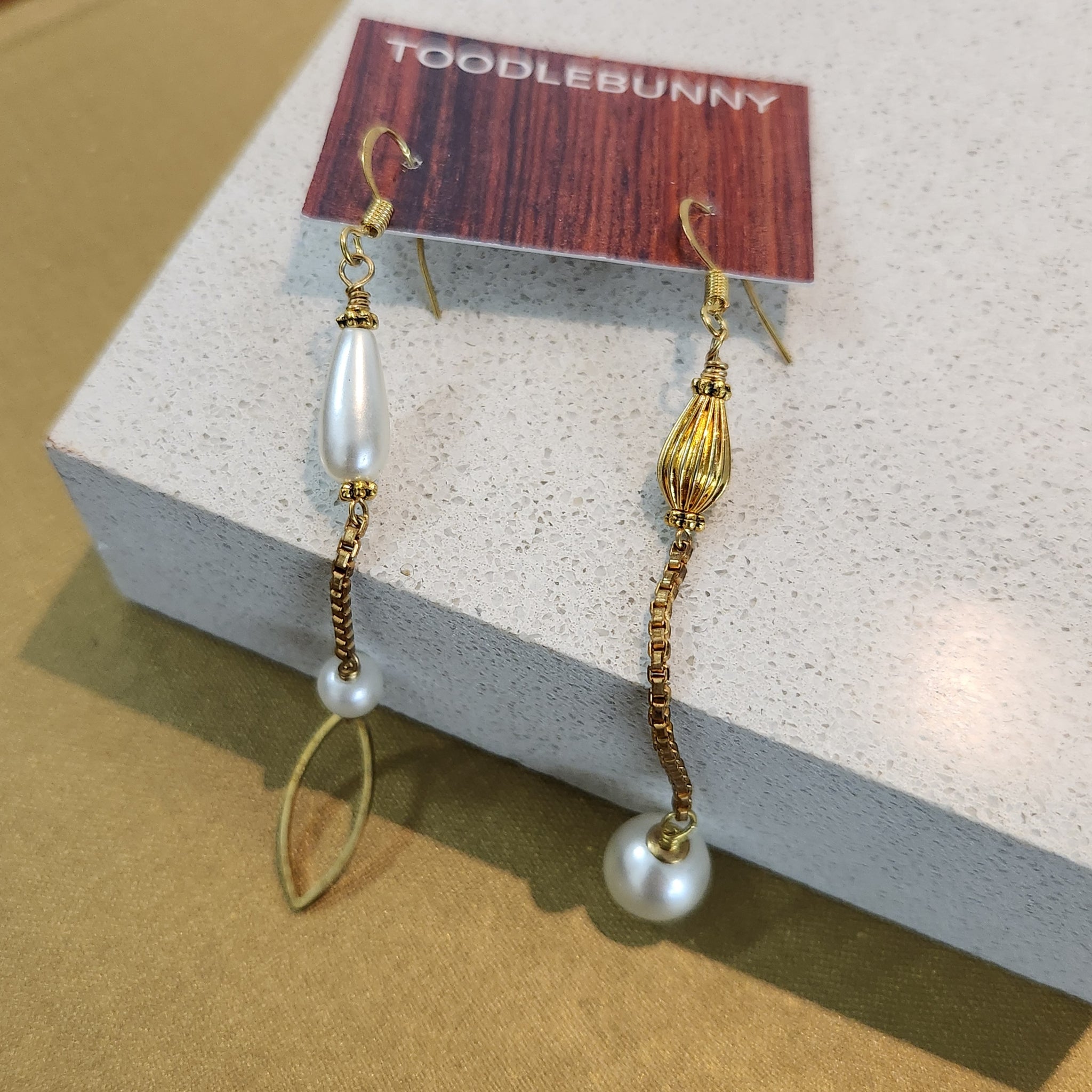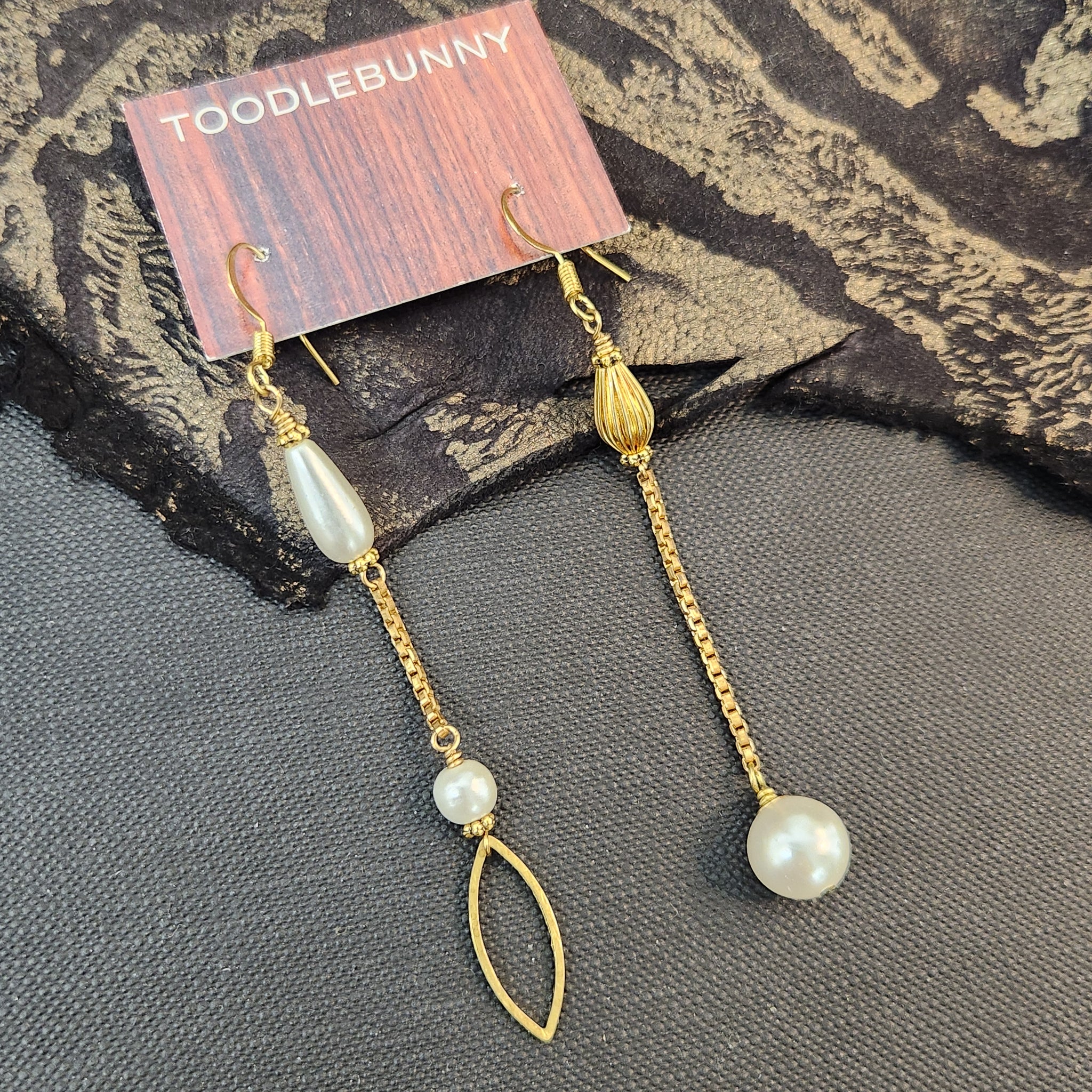 Marquis brass link and vintage corrugated teardrop bead in asymmetric fashion with vintage glass pearls. Vintage brass box chain dusters that are light on the lobes with gold plated Shepard hook earwires.