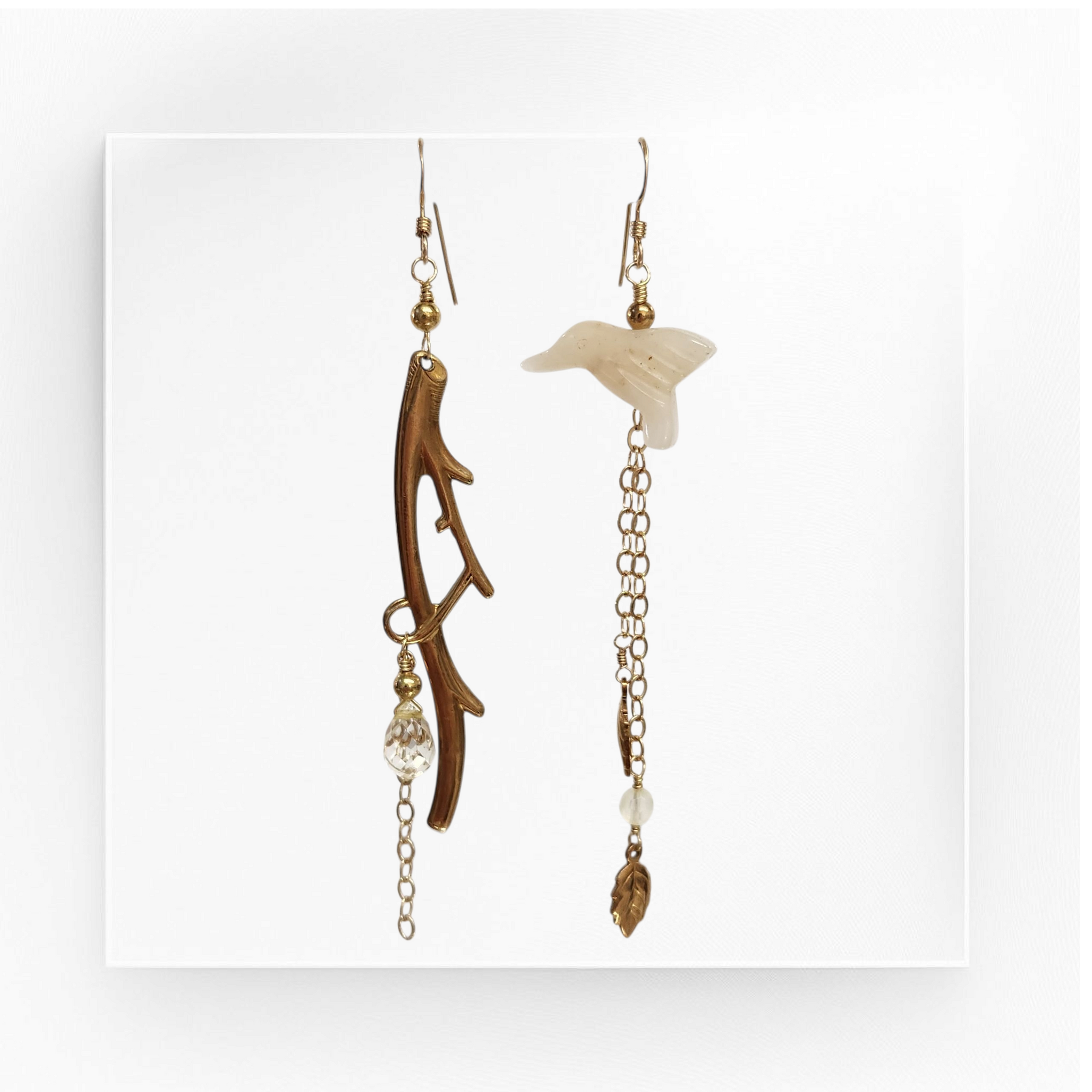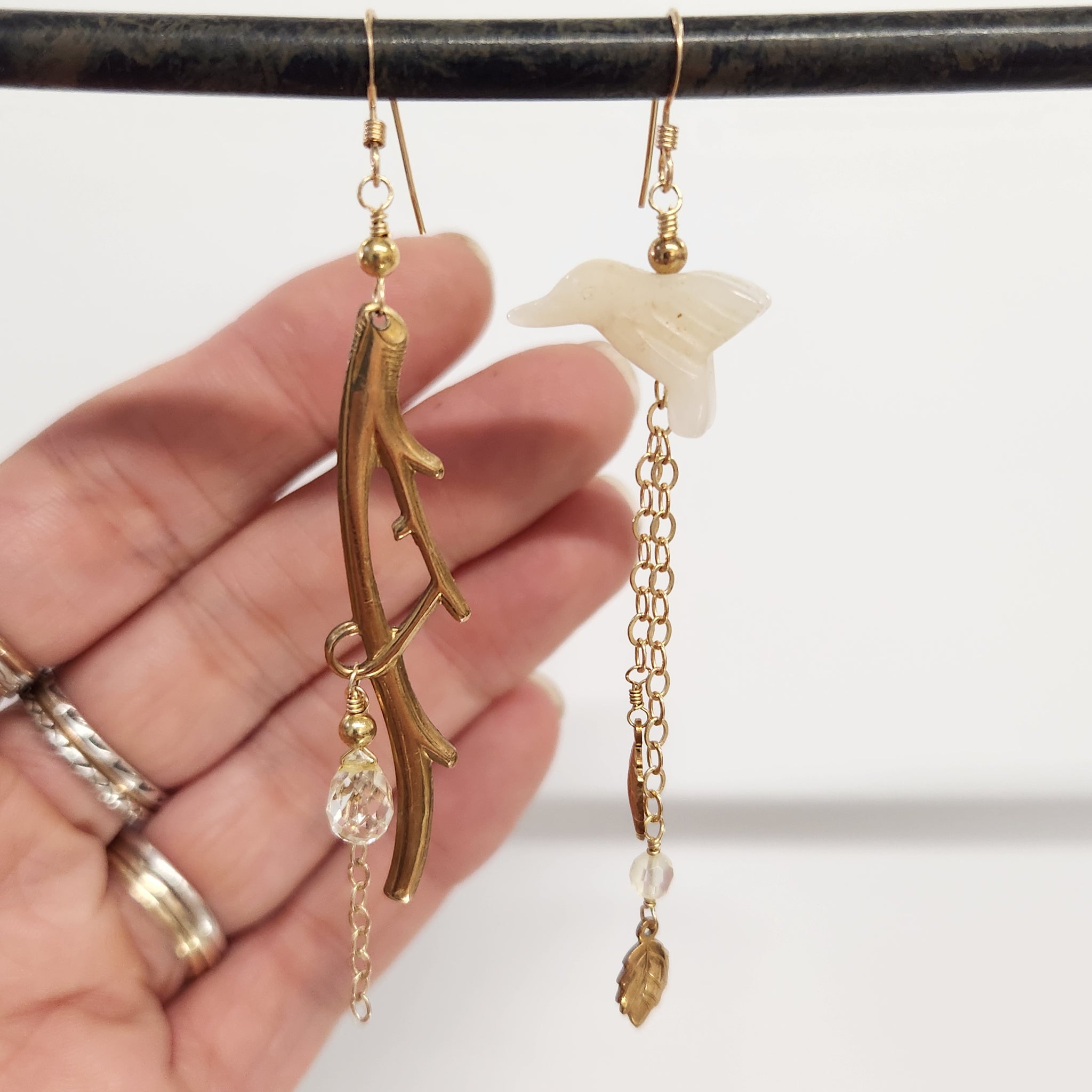 A sturdy brass twig holds a semiprecious faceted citrine briolette and 14k gold filled chain. On the right a hand carved honey jade stone bird fetish perches above 14k gold filled chain with tiny vintage brass leaves and coordinating 4mm stone drop. 14k gold filled earwires.